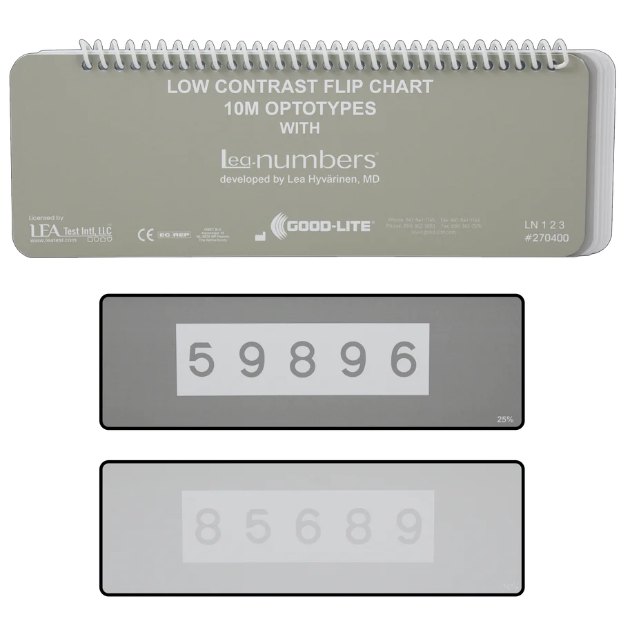 當視覺資訊傳遞的變化僅影響低對比度水平的視力時,可以很容易地測量、記錄和檢測視覺資訊傳遞的變化。這些圖表以以下對比水平顯示數位:25%、10%、5%、2.5%和1.25%。每個圖表有5個偏移頁,便於翻轉。包括記錄表格和說明。