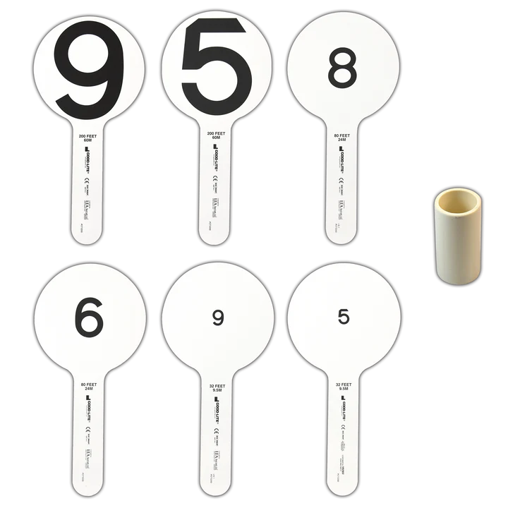 該套件由六個槳組成,每個槳分別對應三種尺寸的光型。對於每對,其中一個槳在一側是空白的。光學類型是LEA NUMBERS®,尺寸印在槳上:200英尺(60米),80英尺(24米)和32英尺(9.5米)。這些以英尺或米為單位的距離表示對於具有20/20(6/6)視力的人來說,您需要握住槳的距離才能勉強識別光型。槳葉在0.4的logMAR步長中改變大小。